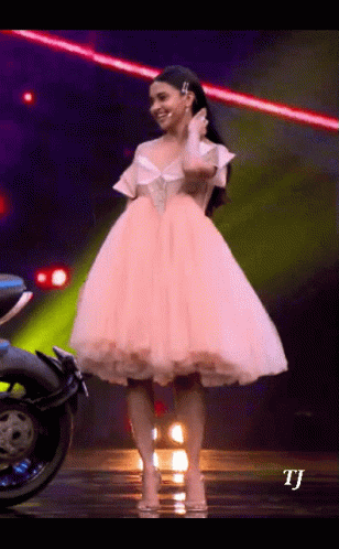 Tejasswi Prakash looking adorable in a pink tutu dress, smiling and posing on stage with bright lights.