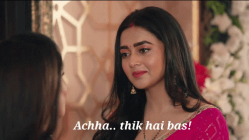 Tejasswi Prakash from Naagin 6, wearing a pink saree, says 'Achha.. thik hai bas!' to another woman.
