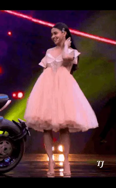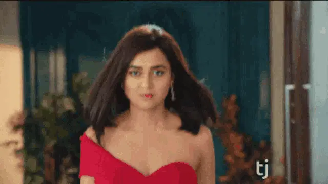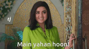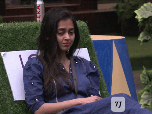 Tejasswi Prakash shrugging with a 'Pata Nahi' expression, sitting outdoors in a blue dress.