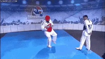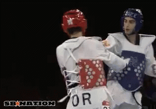 Two taekwondo fighters in a match, one lands a powerful kick and the other celebrates victory.