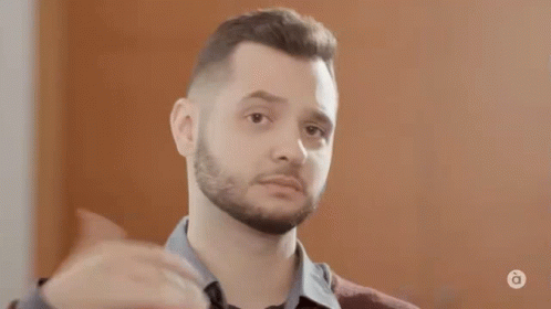 A man with a beard makes a funny face and a hand gesture, looking directly at the camera.