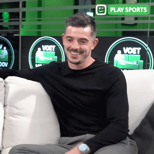 Yannick Thoelen reacts enthusiastically on a couch during a Telenet Play Sports broadcast.