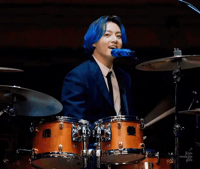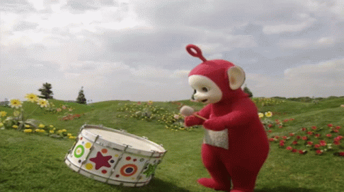 Teletubby Po joyfully plays a colorful drum in a vibrant, flower-filled green field under a cloudy sky.