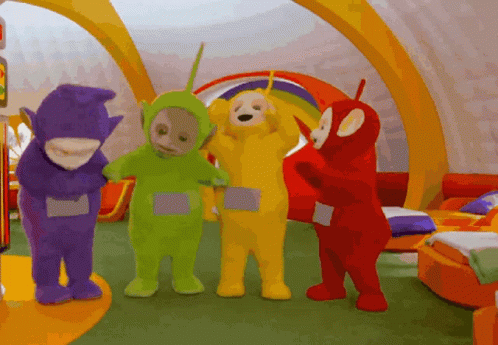 Tinky Winky, Dipsy, Laa Laa, and Po playing together in their colorful home, laughing and having fun.