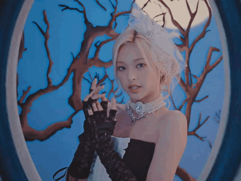 BABYMONSTER's Rora in a black dress and gloves, looking out a window in the 'Tell A Friend Sheesh' music video.