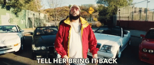Man in a red jacket and white hat rapping in front of cars, with the caption 'Tell Her Bring It Back'.
