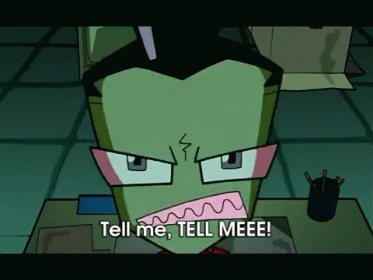 Invader Zim urgently demands answers, shouting 'Tell me, TELL MEEE!' with a furious expression in a dark room.