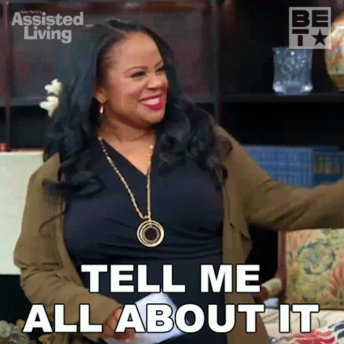 Leah, portrayed by Courtney Nichole from Tyler Perry's Assisted Living, enthusiastically says 'Tell Me All About It'.