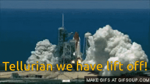 A rocket launches into the sky, surrounded by smoke, with the text 'Tellurian we have lift off!' displayed.