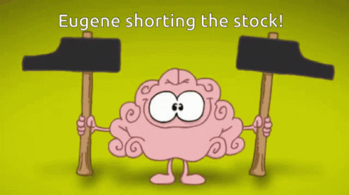 Cartoon brain character Eugene shorting Tellurian LNG stock with two hammers, symbolizing financial market action.