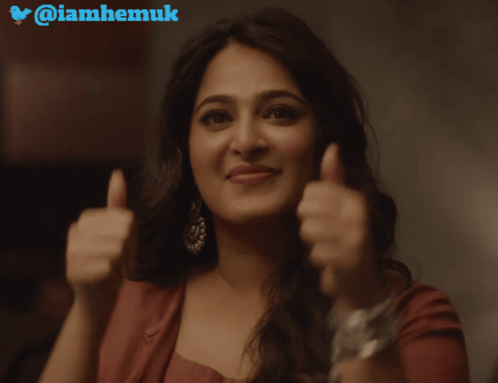 A Telugu actress gives a cheerful double thumbs up, with the handle @iamhemuk visible.