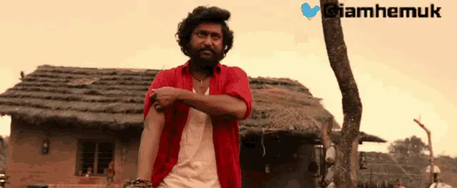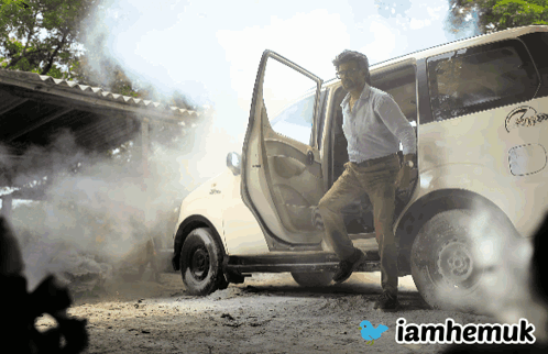 A man dramatically exits a car amidst smoke, with the 'iamhemuk' watermark, in a Telugu style.