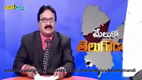 A Telugu news reporter delivers a segment with the on-screen message 'Wake up, Telugu people' and a map of the region.