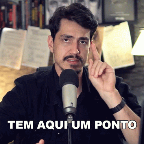 Vitor Santos discusses a point in front of a microphone, with the phrase 'Tem Aqui Um Ponto' displayed.