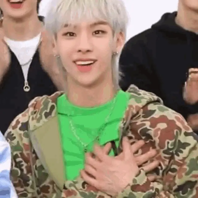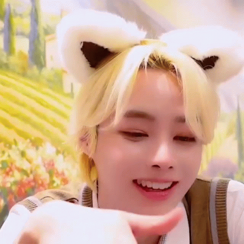 Tempest's Hanbin smiles brightly, wearing cute cat ears and pointing down, against a scenic backdrop.