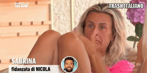 Sabrina, Nicola's girlfriend on Temptation Island, reacts with a shocked expression, exclaiming 'Che Botta!'