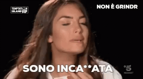 Niloufar from Temptation Island Vip looks annoyed, with Italian captions 'IT'S NOT GRINDR' and 'I AM PISSED OFF'.