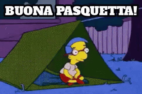Milhouse Simpson enjoys camping in a tent for Easter Monday, with 'Buona Pasquetta' written above him.