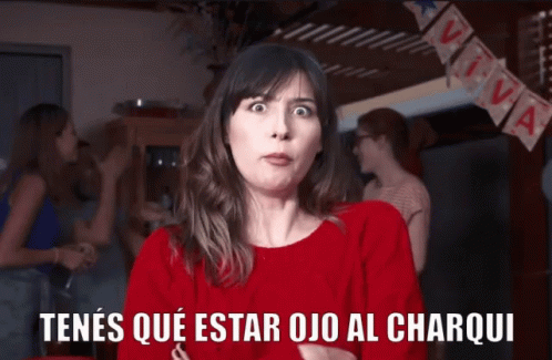 Woman in red sweater emphatically says 'Tenes Que Estar Ojo Al Charqui' with an upset expression.