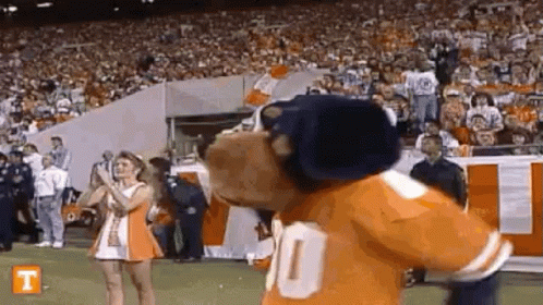 The University of Tennessee's Smokey mascot on the football field, interacting with the crowd and cheerleaders.