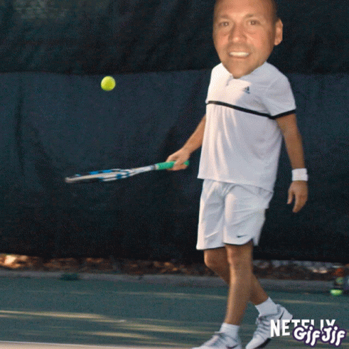 A man with a comically large, smiling head plays tennis on a court, wearing an Adidas shirt and white shorts.