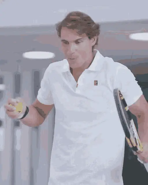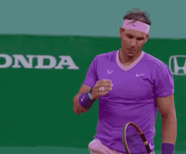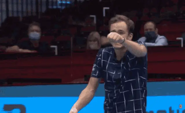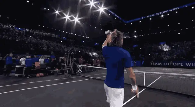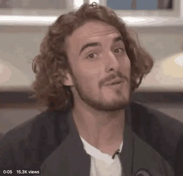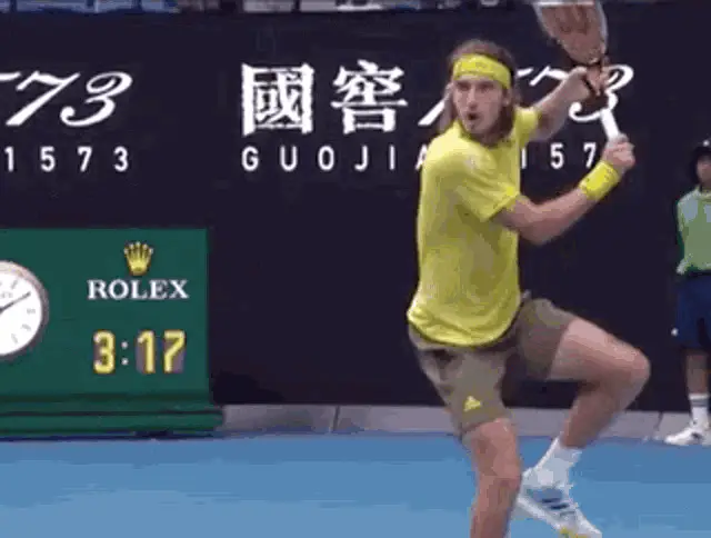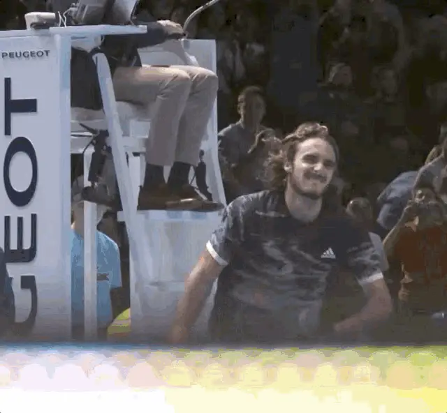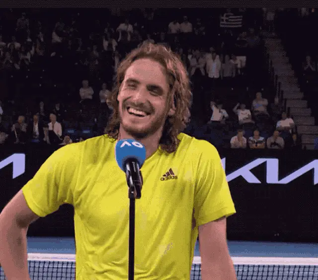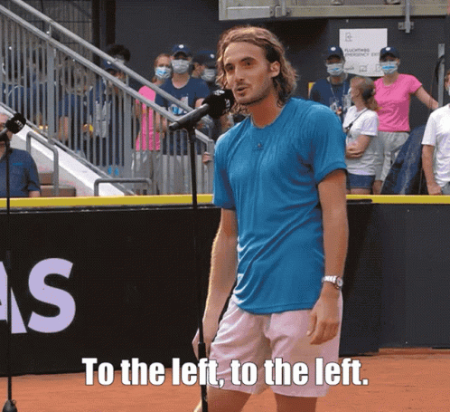 Tennis star Stefanos Tsitsipas gestures and says 'To the left, to the left' during an on-court interview.