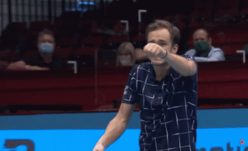 Daniil Medvedev reacting animatedly during a tennis match, holding his racket on the court with an expressive face.