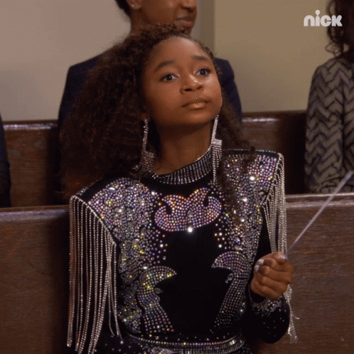 Lay Lay looking tense in a dazzling black and silver outfit, holding a wand.