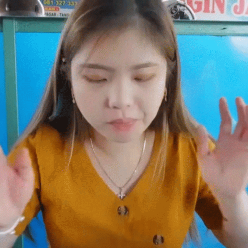 Fifin Liefang claps her hands with a focused expression, wearing a yellow shirt against a blue background.