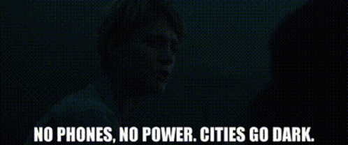 Mackenzie Davis as Grace in Terminator Dark Fate, facing a blackout with 'No Phones, No Power. Cities Go Dark.'