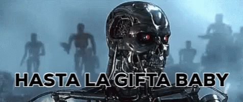 A menacing Terminator endoskeleton with glowing red eyes and the meme phrase "Hasta La Gifta Baby" displayed.