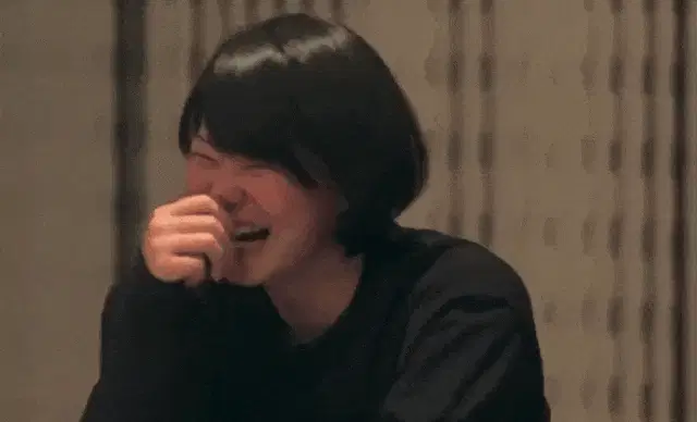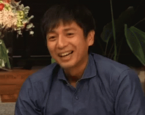 Yoshimi Tokui from Terrace House laughing and covering his face in a blue shirt, showing amusement.
