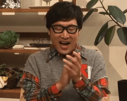 Ryota Yamasato clapping enthusiastically, wearing glasses and a plaid shirt in a living room setting.