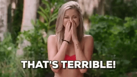 A woman in a bikini reacts to something 'terrible' by covering her mouth, then smiles and laughs.