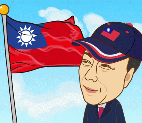 Animated Terry Gou saluting proudly with the Republic of China (Taiwan) flag waving in the background.
