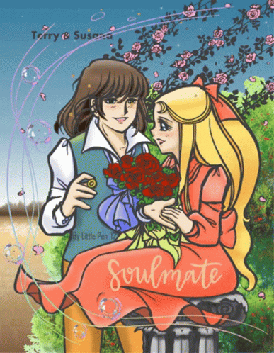 Terry Graham and Susana in a romantic drawing, celebrating their soulmate connection with roses.