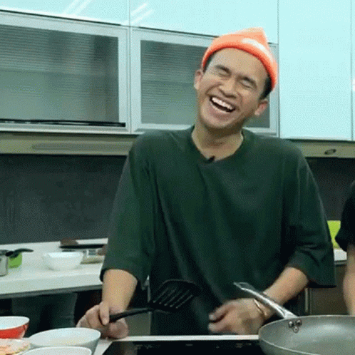 Anwar Bab laughing heartily in a kitchen while holding a spatula, wearing an orange beanie and green shirt.
