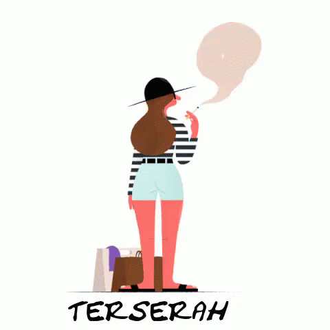 Animated woman in a hat and shorts smoking a cigarette, with the Indonesian word 'Terserah' below.
