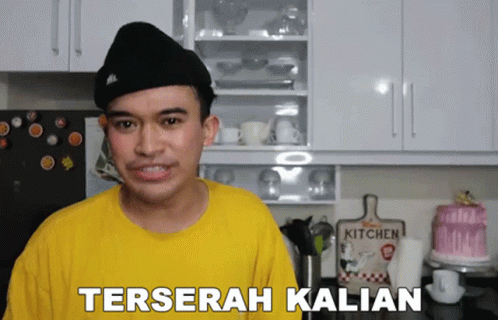 Anwar in a yellow shirt, standing in a kitchen and saying 'Terserah Kalian' (Up to You).