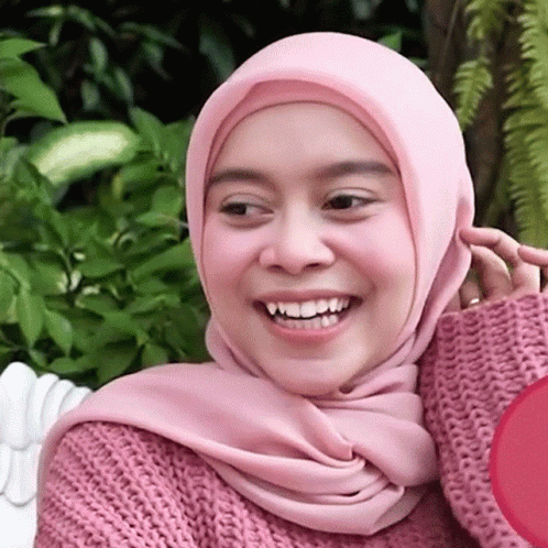 Lesti Kejora laughing joyfully, wearing a pink hijab and cozy sweater, radiating happiness.