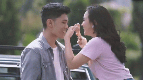 Nuca and Mahalini Raharja share a joyful moment, laughing as Mahalini playfully touches Nuca's face.