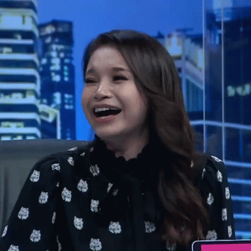 Rossa laughing heartily in a studio setting, wearing a patterned shirt.