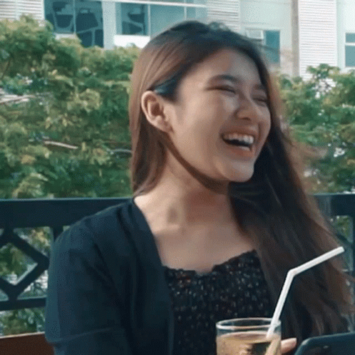 Tiara Andini laughing heartily, holding a drink with a straw in an outdoor setting.