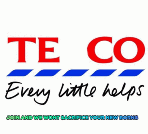 A parody of the Tesco logo featuring the 'Every little helps' slogan and a dark, humorous twist about not sacrificing newborns.