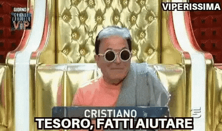 Cristiano Malgioglio, wearing sunglasses, says 'Tesoro, fatti aiutare' (Darling, get help) on Italian TV.