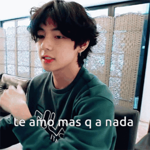 Tete (V from BTS) sends a loving message, 'Te amo mas q a nada' (I love you more than anything), while wearing a Fila sweater.