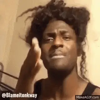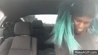 Tete Titi, a woman with vibrant blue hair, is seen sitting and moving in a car.