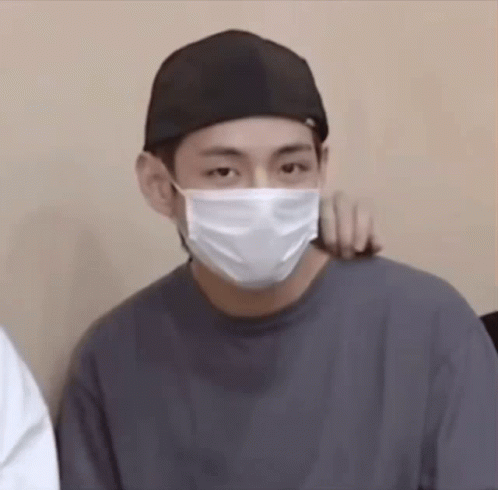 Taehyung, wearing a mask and black cap, gives a double thumbs up with a friendly gesture.