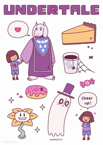 A colorful illustration featuring Undertale characters Frisk, Toriel, Napstablook, and Flowey with iconic game items.