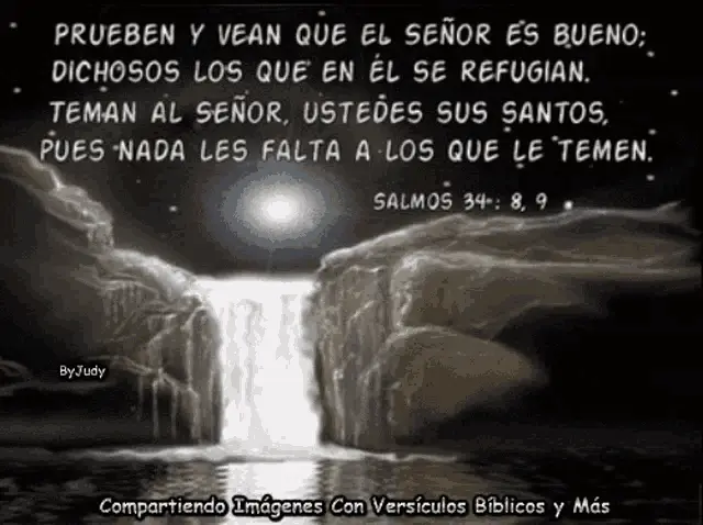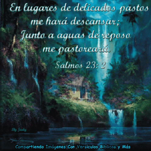 A serene image featuring a waterfall and a cabin, accompanied by the inspiring Bible verse Salmos 23:2 about rest and guidance.